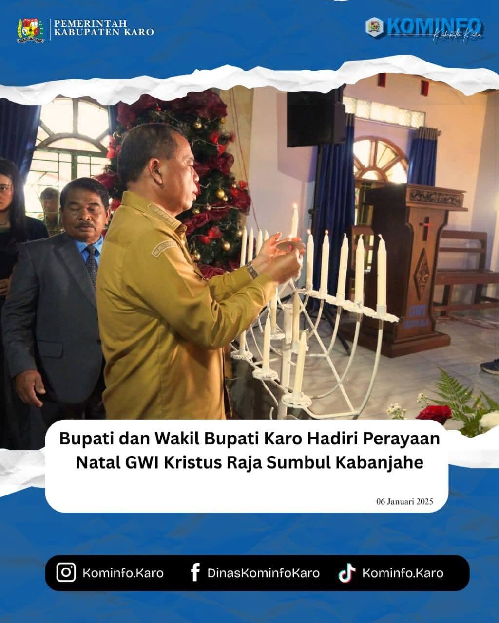 Bupati Karo, Brigjen Pol (Purn) Dr. dr. Antonius Ginting, Sp.OG., M.Kes., bersama Wakil Bupati Karo, Komando Tarigan, SP., menghadiri Perayaan Natal Gereja Bethel Indonesia (GWI) Kristus Raja Sumbul Kabanjahe, yang dilaksanakan, Selasa (6/1/2026)