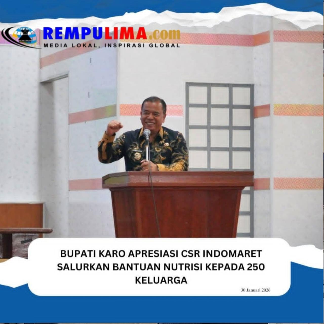 Pemerintah Kabupaten Karo mengapresiasi komitmen PT Indomarco Prismatama (Indomaret) dalam menyalurkan bantuan nutrisi kepada masyarakat melalui program Corporate Social Responsibility (CSR). Apresiasi tersebut disampaikan oleh Bupati Karo, Brigjen Pol (Purn) Dr. dr. Antonius Ginting, Sp.OG., M.Kes., di dampingi Sekda Kab Karo, Gelora Kurnia Putra Ginting, S.STP., MM., dan Kepala OPD terkait pada acara Pemberian Bantuan Nutrisi Indomaret & Vidoran yang berlangsung di Aula Rakutta Berahmana Kantor Bupati Karo, Jumat (30/01/2026).