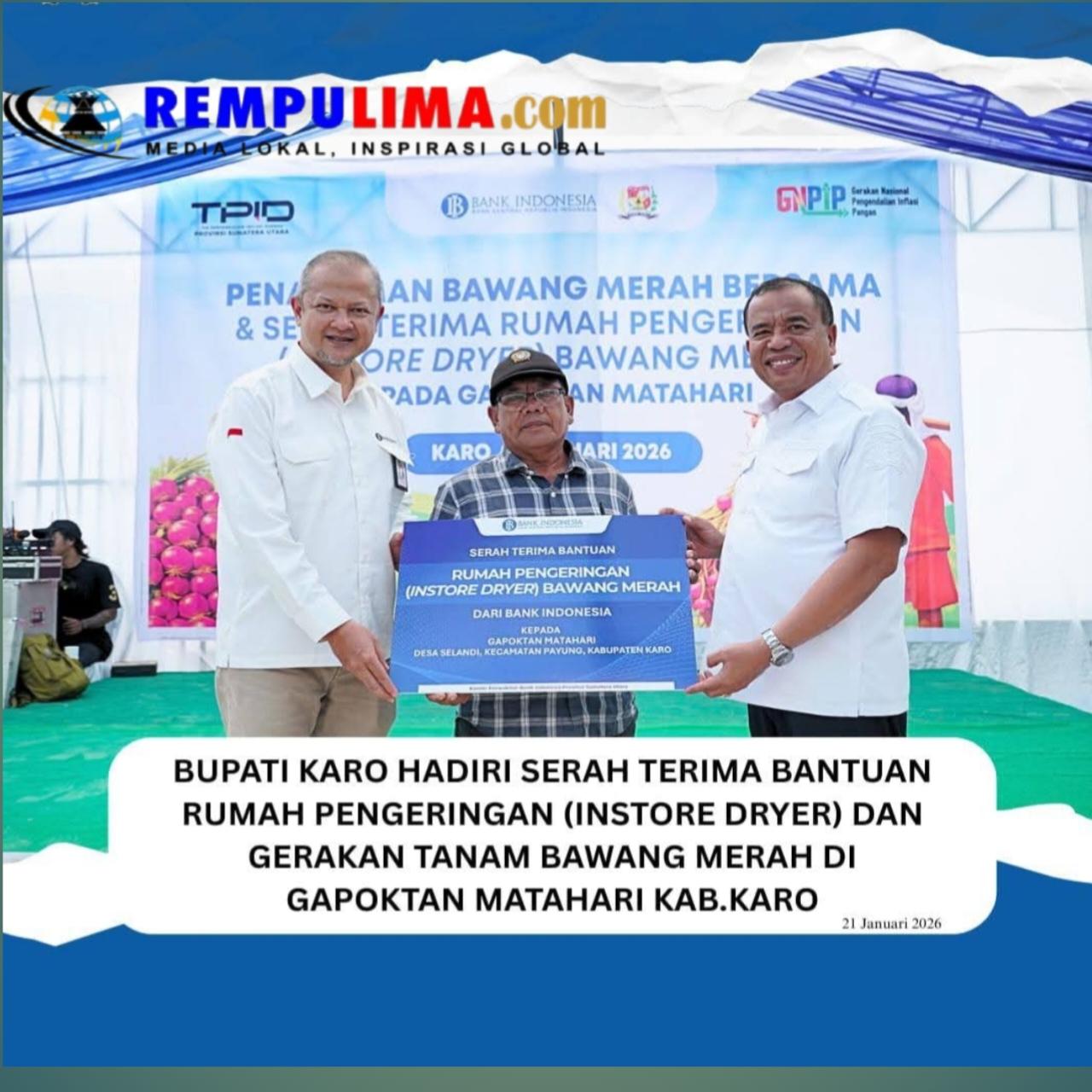 Bupati Karo, Brigjen Pol (Purn) Dr.dr. Antonius Ginting, Sp.OG., M.Kes, menghadiri acara seremoni serah terima bantuan Instore Dryer (Rumah Pengering) dan Gerakan Penanaman Bawang Merah yang dipusatkan di Desa Selandi, Kecamatan Payung, Rabu (21/01/2026).