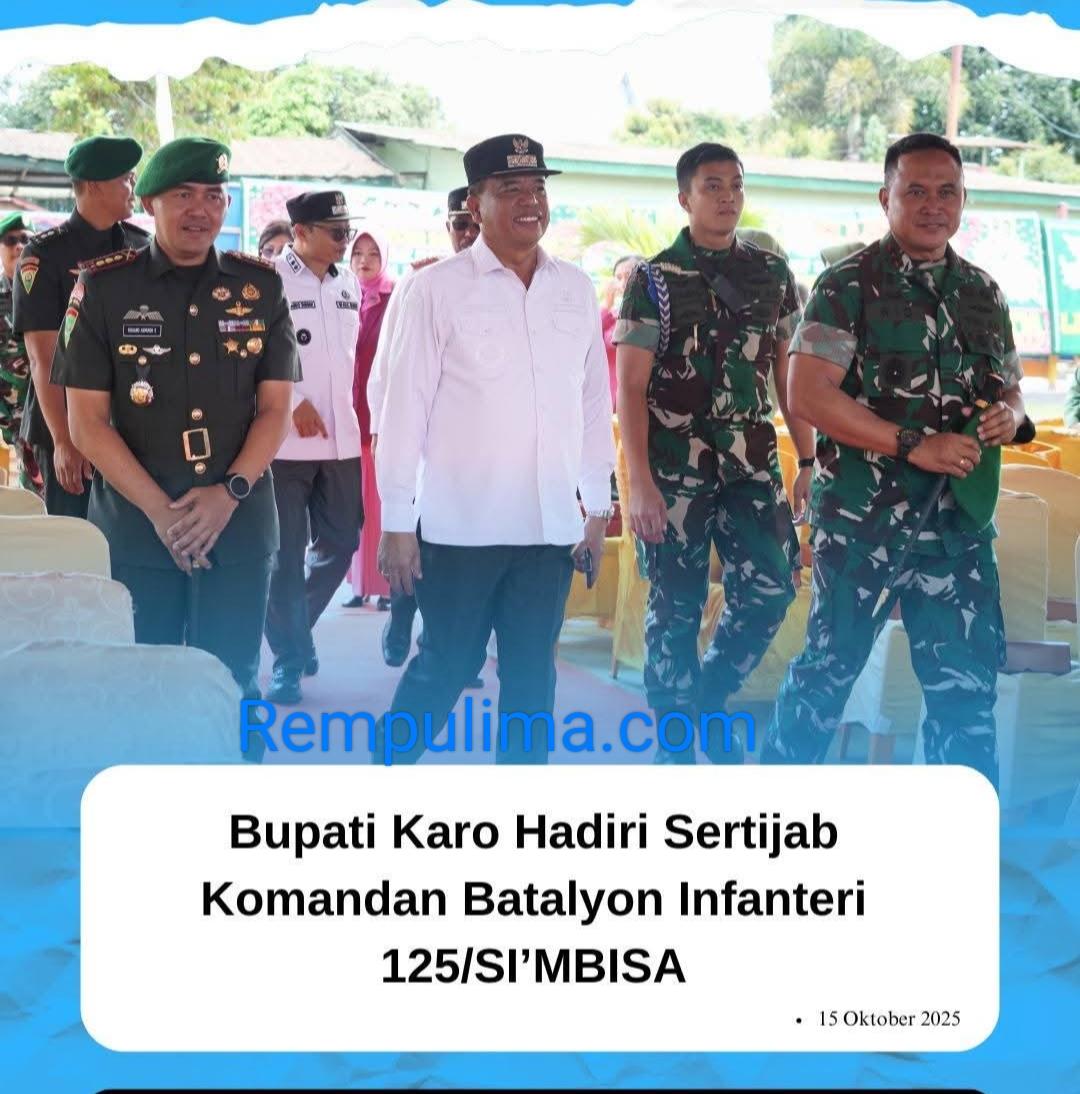Bupati Karo, Antonius Ginting, hadiri sertijab Komandan Batalyon Infanteri 125/SI’MBISA dari Letkol Inf Haris Nur Priatno, S.Sos., M.I.P., kepada Letkol Inf Hari Mughnii Nagara, S.E., M.H.I., didampingi Jajaran FOKOPIMDA dan dihadiri oleh Pangdam I/BB, Mayjen TNI Rio Firdianto, S.H., Danbrigif 7/RR, Kol Inf Dadang Armada Sari, S.Ip., Wakil Bupati Toba, Audi Murphy O. Sitorus. Kegiatan ini dilaksanakan di Lapangan Batalyon Infanteri 125/Simbisa, Rabu (15/10/2025)