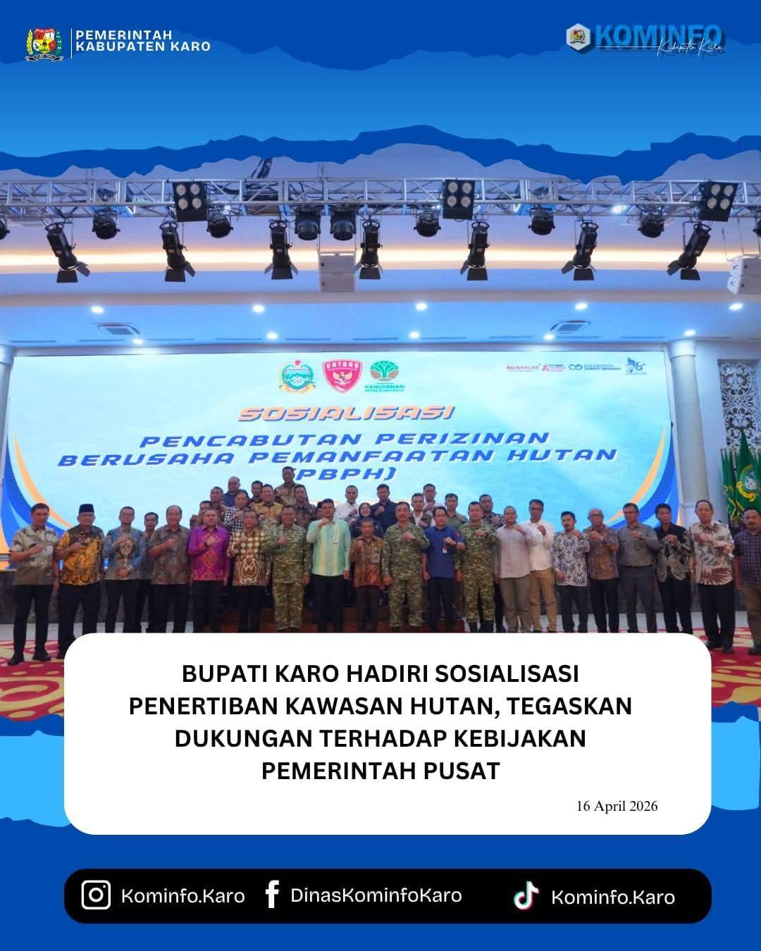 Bupati Karo, Brigjen Pol (Purn) Dr. dr. Antonius Ginting, Sp.OG., M.Kes., menghadiri kegiatan Sosialisasi Pencabutan Perizinan Berusaha Pemanfaatan Hutan (PBPH) yang diselenggarakan oleh Satuan Tugas Penertiban Kawasan Hutan (Satgas PKH), bertempat di Kantor Gubernur Sumatera Utara, Kamis (16/04/2026).