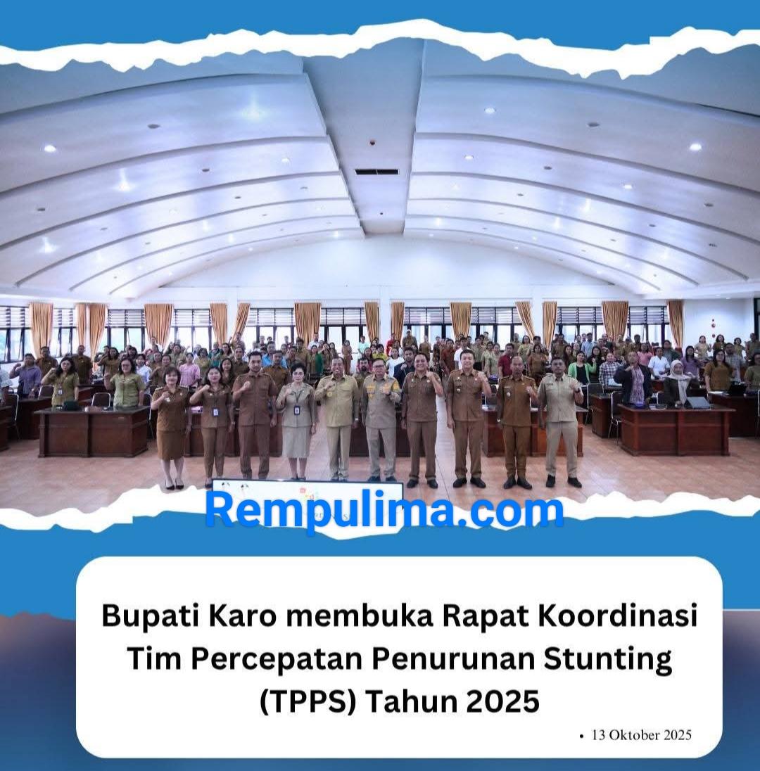 Bupati Karo, Antonius Ginting, didampingi Wakil Bupati Karo, Komando Tarigan, SP, Plt Kepala Dinas Pemberdayaan Perempuan dan Perlindungan Anak dan Pengendalian Penduduk Kabupaten Karo, Data Martina Br Ginting,AP, M.Si, Plt Badan Perencanaan Pembangunan, Penelitian, dan Pengembangan Daerah Abel Tarwai Tarigan, S.Sos, MT, membuka Rapat Koordinasi Tim Percepatan Penurunan Stunting (TPPS) Tahun 2025 yang dilaksanakan di Aula Kantor Bupati, Senin (13/10/2025)