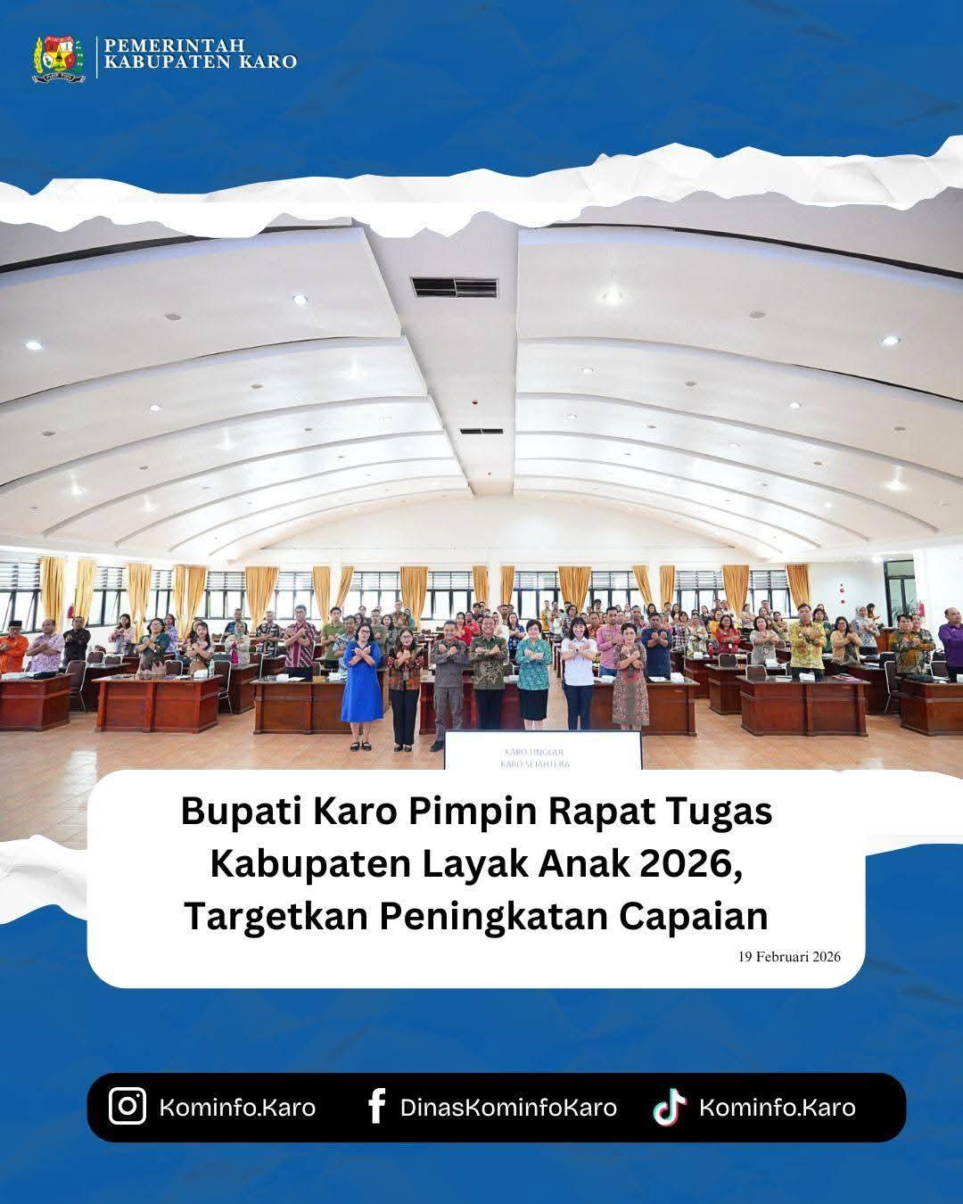 Bupati Karo, Brigjen Pol (Purn) Dr. dr. Antonius Ginting, Sp.OG., M.Kes., secara resmi memimpin Rapat Koordinasi Gugus Tugas Kabupaten Layak Anak (KLA) Kabupaten Karo Tahun 2026. Kegiatan ini berlangsung dengan khidmat di Aula Rakoetta Brahmana, Kantor Bupati Karo, Kamis (19/02/2026).