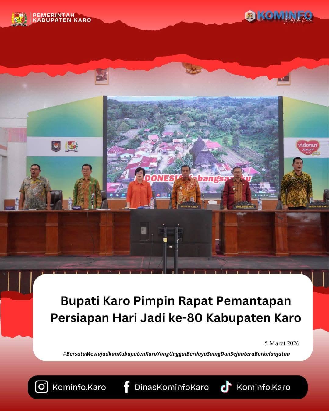 Menjelang peringatan Hari Jadi ke-80 Kabupaten Karo, Pemerintah Kabupaten Karo menggelar rapat pemantapan persiapan kegiatan yang berlangsung di Aula Rakutta Sembiring Brahmana Kantor Bupati Karo, Kamis (5/3/2026).