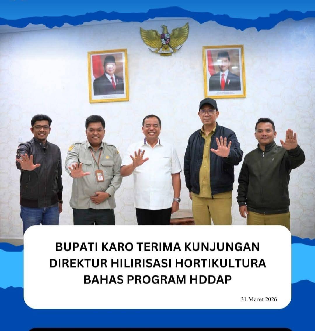 Bupati Karo, Brigjen Pol (Purn) Dr. dr. Antonius Ginting, Sp.OG., M.Kes., menerima kunjungan Direktur Hilirisasi Hasil Hortikultura Direktorat Jenderal Hortikultura Kementerian Pertanian RI, Freddy, S.T.P., M.Sc., M.P.S., Ph.D., dalam rangka membahas pelaksanaan kegiatan Horticulture Development in Dryland Areas Sector Project (HDDAP) atau Pengembangan Hortikultura di Lahan Kering di Kabupaten Karo, Selasa (31/3/2026).