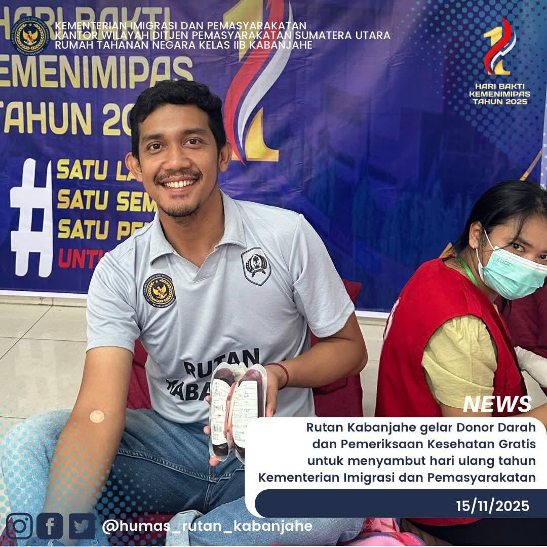 Dalam rangka menyemarakkan Hari Ulang Tahun Kementerian Imigrasi dan Pemasyarakatan Ke-1, Unit Pelaksana Teknis Pemasyarakatan melaksanakan kegiatan Donor Darah dan Pemeriksaan Kesehatan Gratis yang dilaksanakan di Rutan Kabanjahe, Sabtu (15/11/2025)