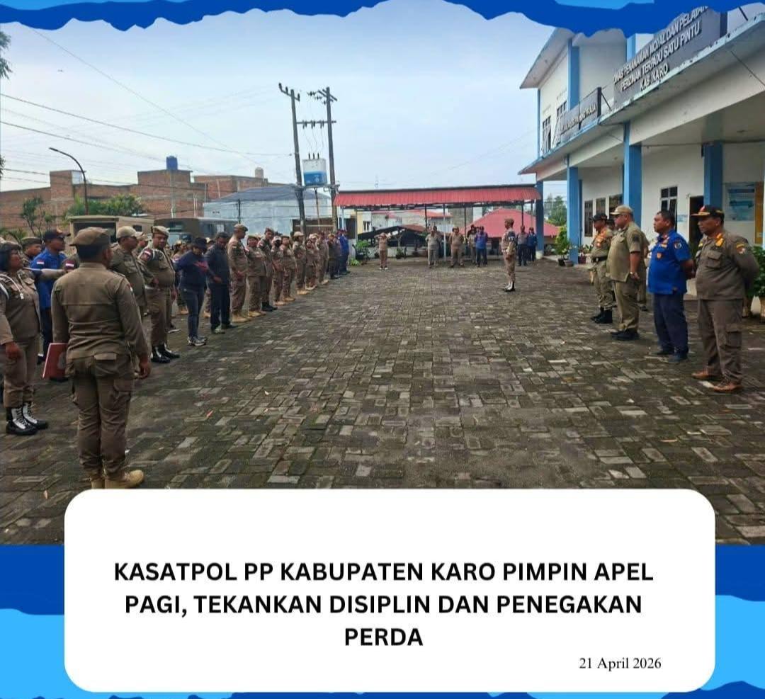 Dalam rangka mendukung pelaksanaan tugas dan fungsi serta mewujudkan visi dan misi Bupati Karo, Brigjen Pol (Purn.) Dr. dr. Antonius Ginting, Sp.OG, M.Kes., Satuan Polisi Pamong Praja Kabupaten Karo,Selasa (21/4/2026 ) melaksanakan kegiatan apel pagi yang dipimpin langsung oleh Kepala Satuan Polisi Pamong Praja Kabupaten Karo, Jon Karnanta Sembiring, S.T., M.Si.