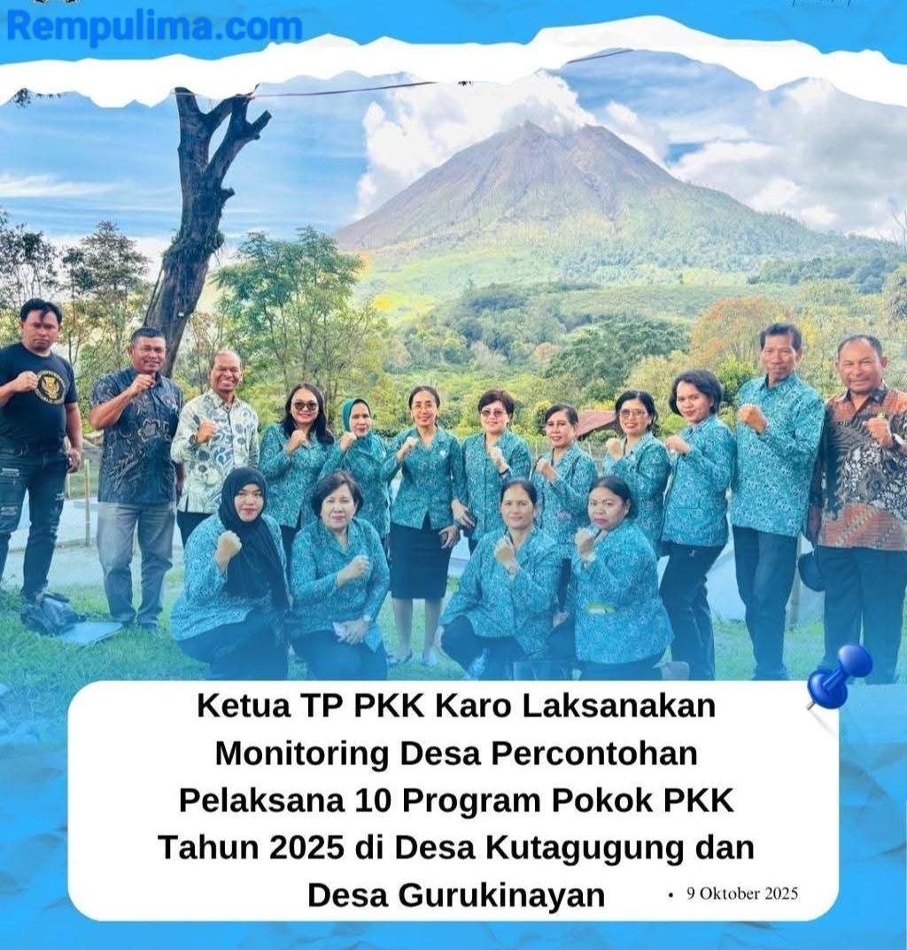 Ketua Tim Penggerak PKK Kabupaten Karo, Ny. Roswitha Antonius Ginting, bersama Tim Supervisi melaksanakan kegiatan monitoring dan supervisi lomba Desa Percontohan Pelaksana 10 Program Pokok PKK Tahun 2025 di Desa Kuta Gugung, Kecamatan Naman Teran dan Desa Guru Kinayan, Kecamatan Payung, Kamis (09/10/2025).