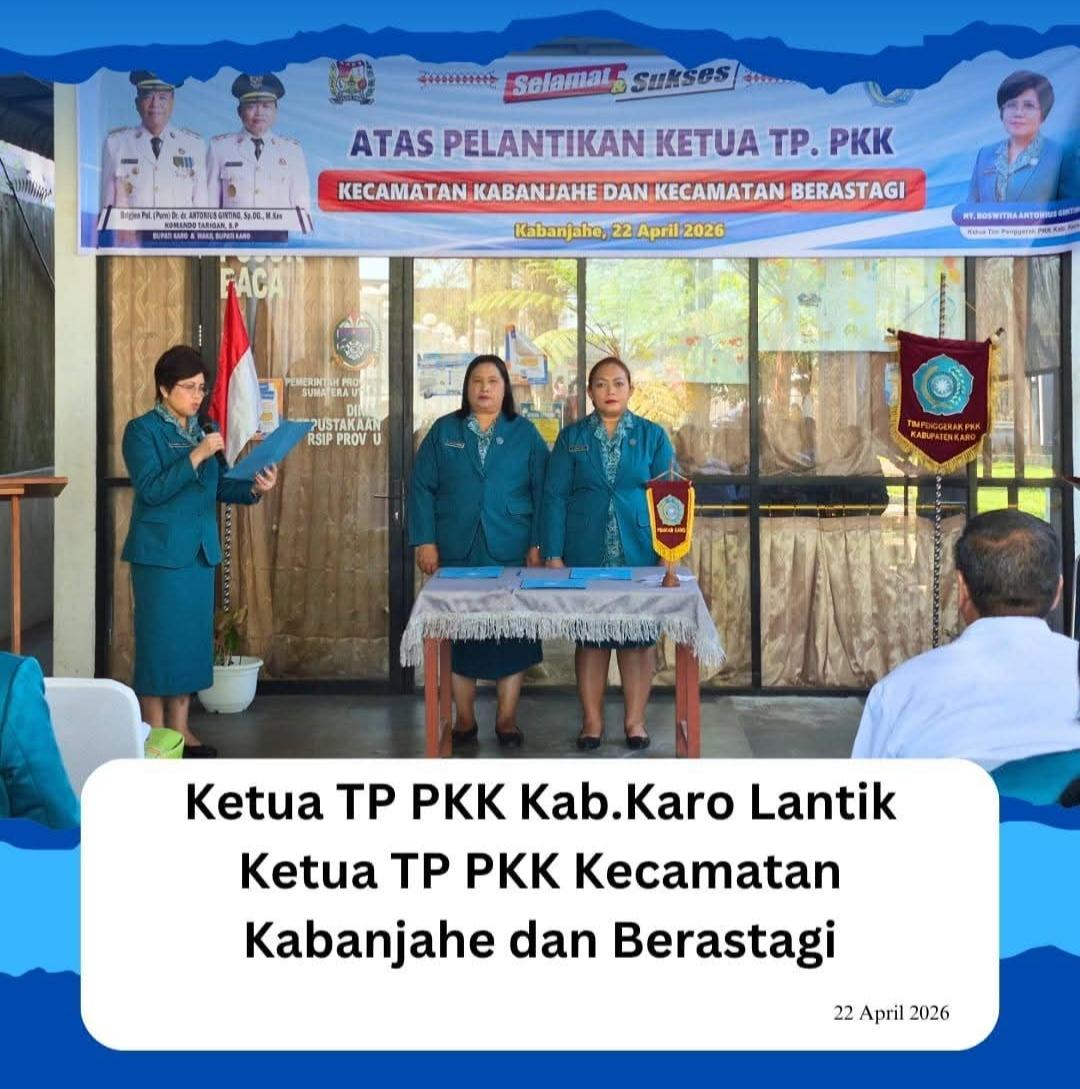 Ketua Tim Penggerak PKK Kabupaten Karo, Ny. Roswitha Antonius Ginting, melantik Ketua Tim Penggerak PKK Kecamatan Kabanjahe dan Kecamatan Berastagi yang berlangsung di Kantor PKK Kabupaten Karo, Rabu (22/04/2026).