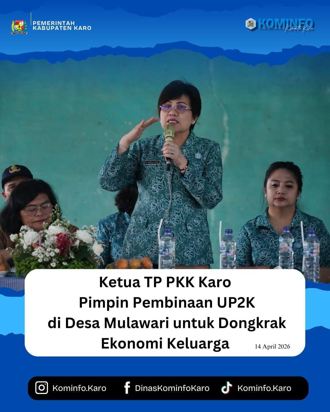 Ketua Tim Penggerak Pemberdayaan Kesejahteraan Keluarga (TP PKK) Kabupaten Karo, Ny. Roswhita Antonius Ginting, melakukan kunjungan kerja dalam rangka Pembinaan Usaha Peningkatan Pendapatan Keluarga (UP2K) PKK di Desa Mulawari, Kecamatan Tigapanah, Selasa (14/04/2026).