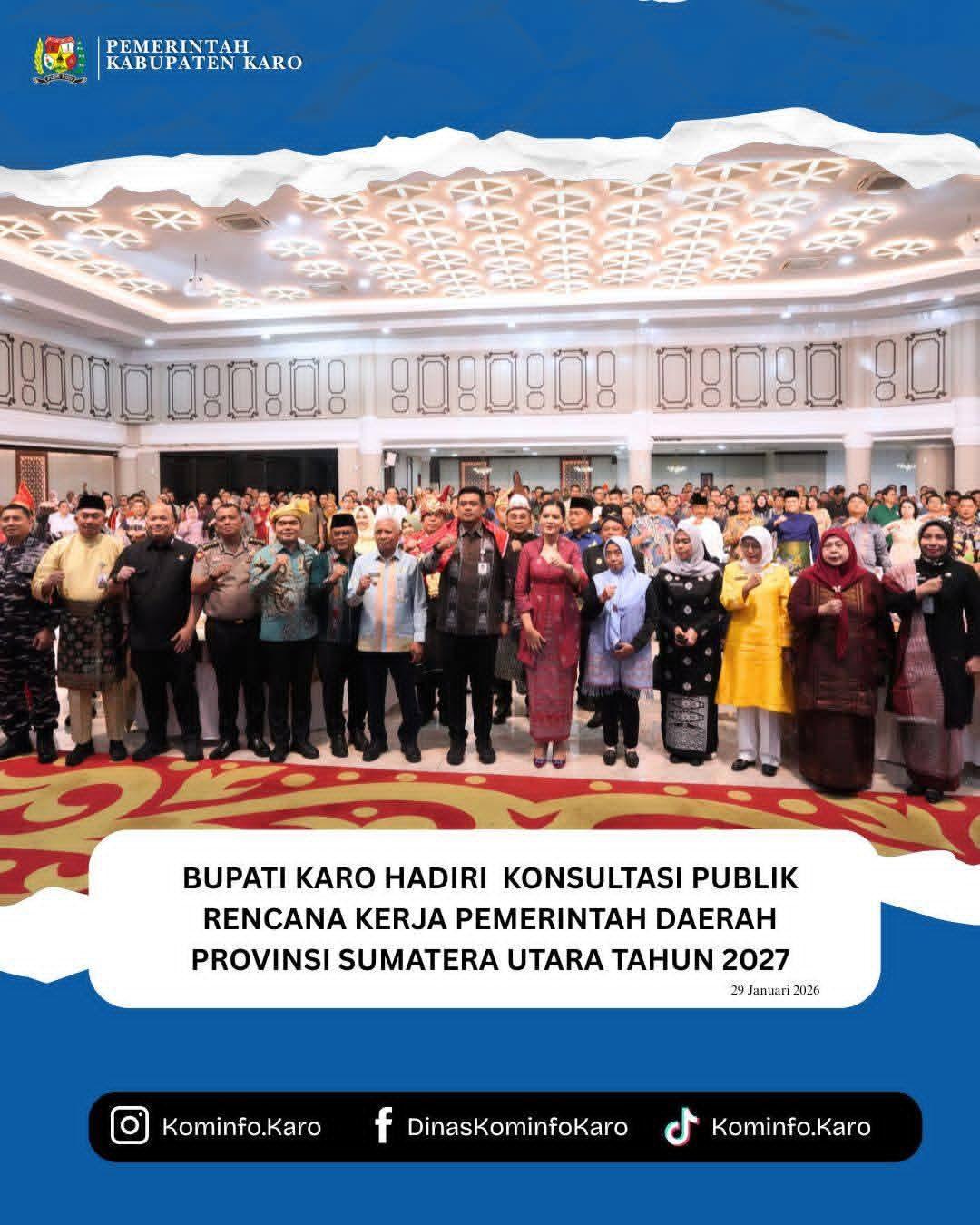 Bupati Karo, Brigjen Pol (Purn) Dr. dr. Antonius Ginting, Sp.OG., M.Kes., menghadiri Konsultasi Publik Rencana Kerja Pemerintah Daerah (RKPD) Provinsi Sumatera Utara Tahun 2027 yang dibuka oleh Gubernur Sumatera Utara, Muhammad Bobby Afif Nasution, di Aula Tengku Rizal Nurdin, Kantor Gubernur Sumatera Utara, Kamis (29/01/2026).
