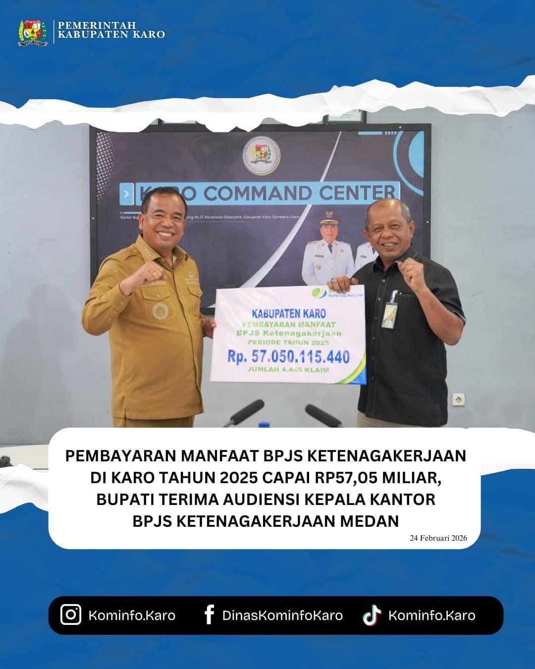 Bupati Karo, Brigjen Pol (Purn) Dr. dr. Antonius Ginting, Sp.OG., M.Kes., menerima kunjungan audiensi dari Kepala Kantor BPJS Ketenagakerjaan Medan di ruang KCC Kantor Bupati Karo, Selasa (24/2/2026). Pertemuan tersebut difokuskan pada evaluasi dan realisasi klaim manfaat yang telah diterima oleh masyarakat Kabupaten Karo.