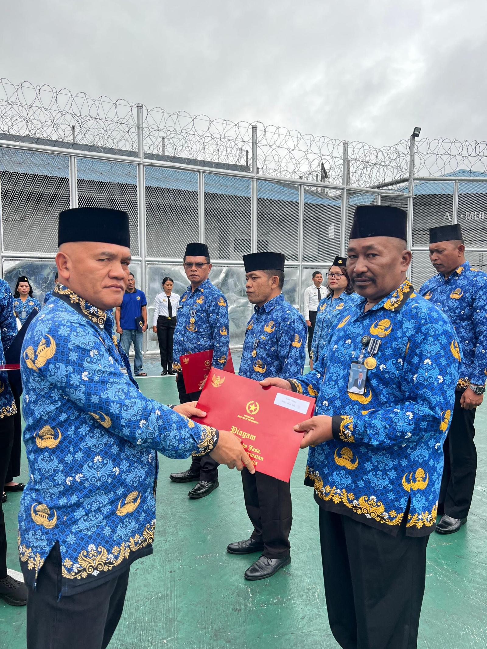 Pada kesempatan tersebut, dilakukan penyematan Tanda Satyalencana Karya Satya secara simbolis kepada pegawai Rutan Kabanjahe yang telah memenuhi masa pengabdian, disertai dengan penyerahan piagam penghargaan. Prosesi berlangsung tertib dan penuh rasa bangga, mencerminkan komitmen bersama dalam membangun budaya kerja yang berintegritas.