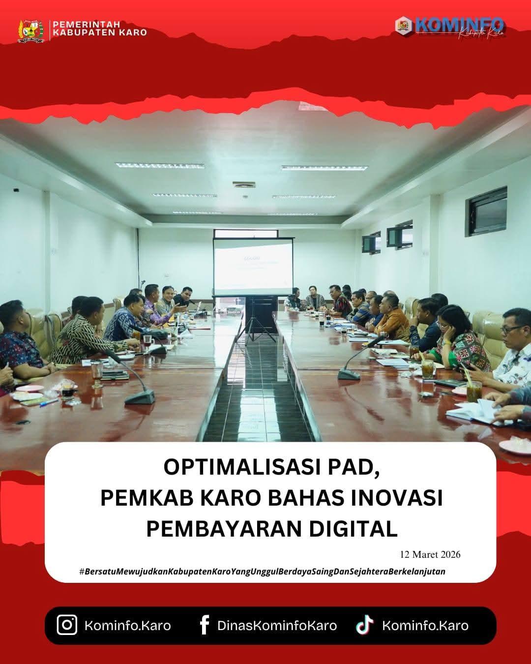 Bupati Karo, Brigjen Pol (Purn) Dr. dr. Antonius Ginting, Sp.OG., M.Kes., melalui Sekretaris Daerah Kab. Karo, Gelora Kurnia Putra Ginting, S.STP., MM., memimpin rapat pembahasan optimalisasi Pendapatan Asli Daerah (PAD) melalui digitalisasi pembayaran di Ruang Rapat Matang Sitepu Kantor Bupati Karo, Kamis (12/3/2026).
