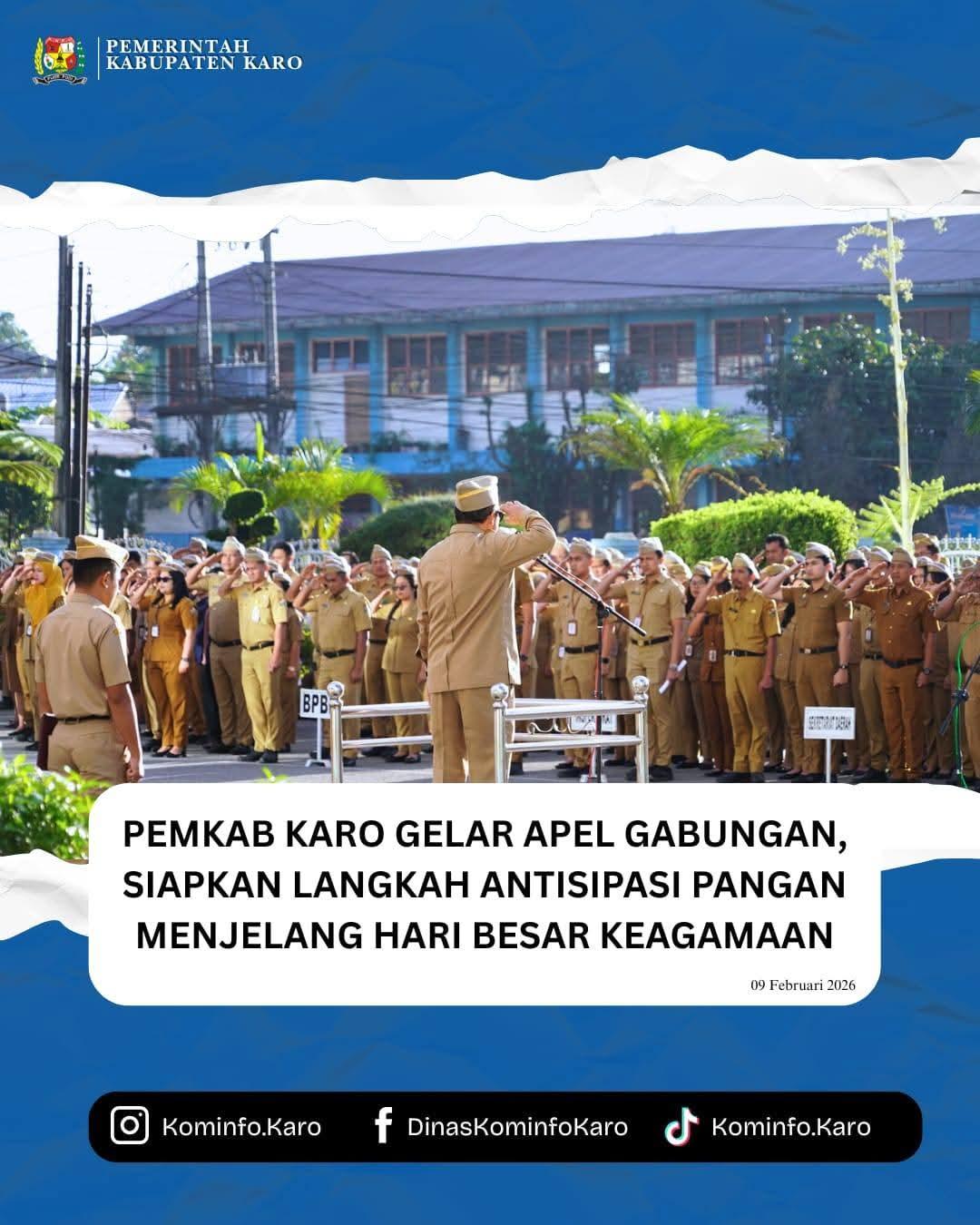 Bupati Karo, Brigjen Pol (Purn) Dr. dr. Antonius Ginting, Sp.OG., M.Kes, yang diwakili oleh Wakil Bupati Karo, Komando Tarigan, SP., bertindak sebagai pimpinan apel pada Apel Gabungan yang dilaksanakan di halaman Kantor Bupati Karo, Senin (09/02/2026).