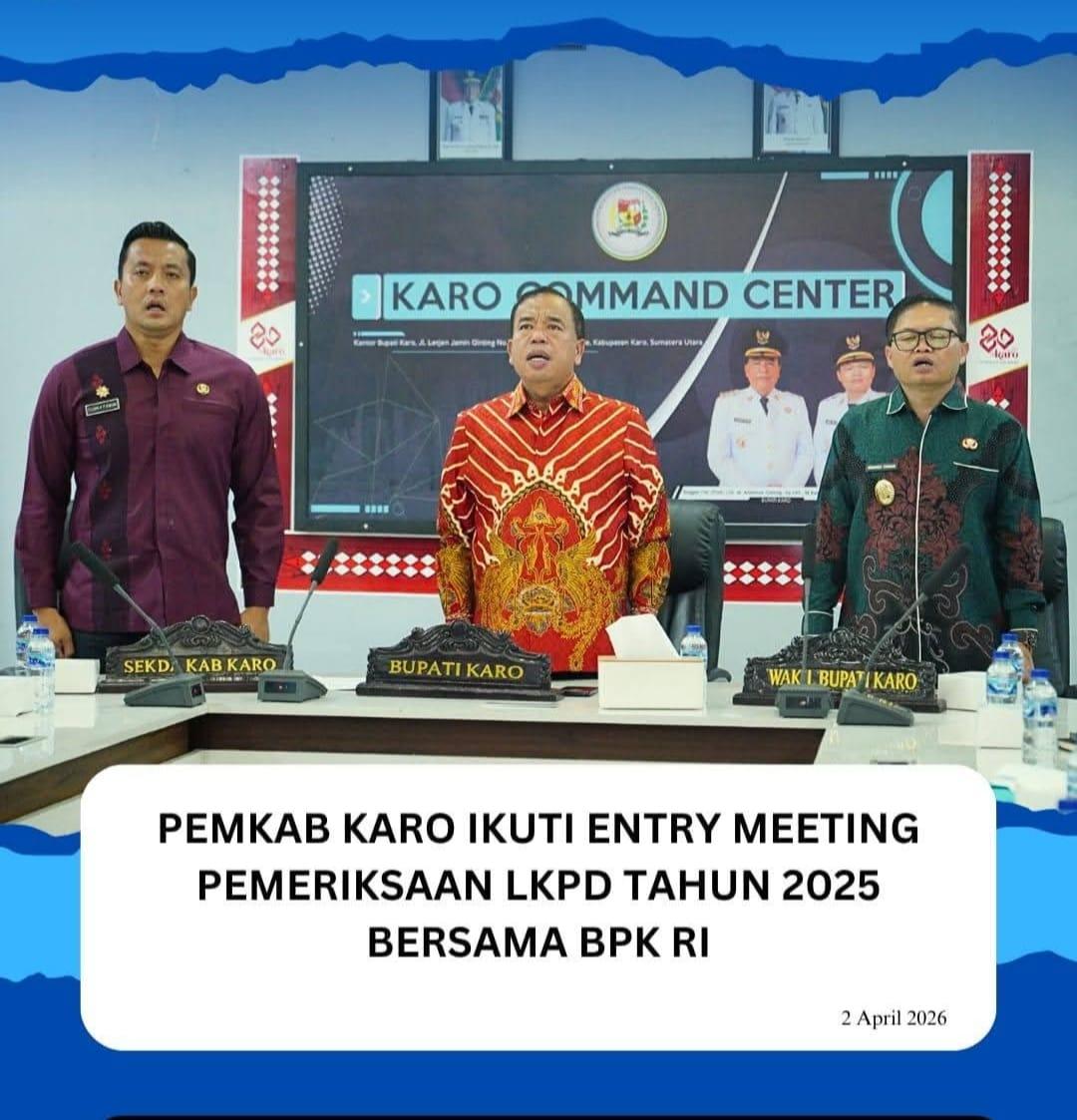 Bupati Karo didampingi Wakil Bupati Karo dan Sekretaris Daerah Kabupaten Karo mengikuti Entry Meeting Pemeriksaan Laporan Keuangan Pemerintah Daerah (LKPD) Tahun 2025 yang diselenggarakan oleh Badan Pemeriksa Keuangan Republik Indonesia (BPK RI), Kamis (2/4/2026). Kegiatan tersebut diikuti secara daring melalui Zoom Meeting dari Ruang Karo Command Center (KCC) Kantor Bupati Karo.