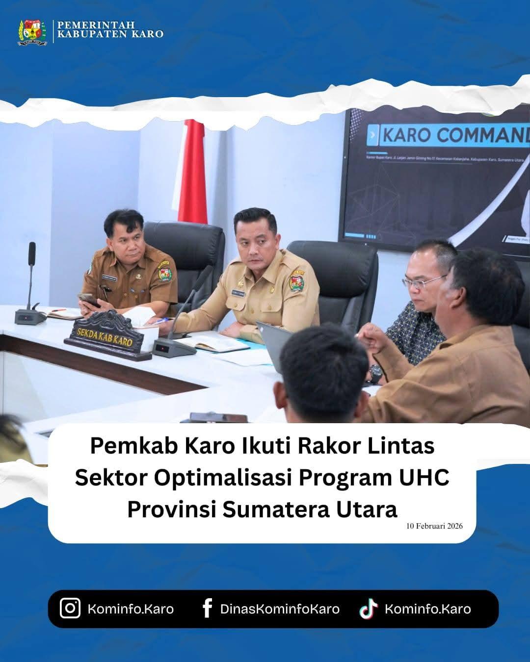 Bupati Karo, Brigjen Pol (Purn) Dr. dr. Antonius Ginting, Sp.OG., M.Kes., yang diwakili oleh Sekretaris Daerah Kabupaten Karo, Gelora Kurnia Putra Ginting, S.STP, M.M., menghadiri Rapat Koordinasi Lintas Sektor terkait Pelaksanaan Program Universal Health Coverage (UHC) Provinsi Sumatera Utara yang dilaksanakan secara daring melalui Zoom Meeting, bertempat di Ruang KCC Kantor Bupati Karo, Selasa (10/02/2026).