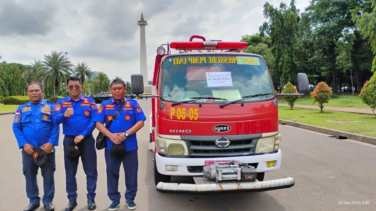 Kegiatan penyerahan hibah berlangsung di Kawasan Monumen Nasional (Monas), Jakarta Pusat, Senin (29/12/2025). Hibah tersebut merupakan bagian dari program Pemerintah Provinsi DKI Jakarta dalam memperkuat sinergi antar daerah dan mendukung peningkatan kapasitas penanggulangan kebakaran di daerah.