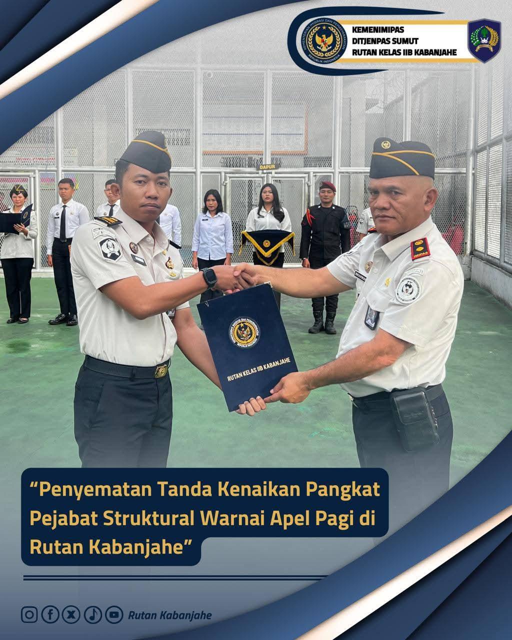 Acara penyematan tanda pangkat yang dipimpin langsung oleh Kepala Rutan Kabanjahe, yang bertindak sebagai pembina apel. Dalam prosesinya, tanda pangkat baru disematkan sebagai bentuk apresiasi atas dedikasi, loyalitas, dan kinerja tinggi yang telah diberikan selama masa tugas