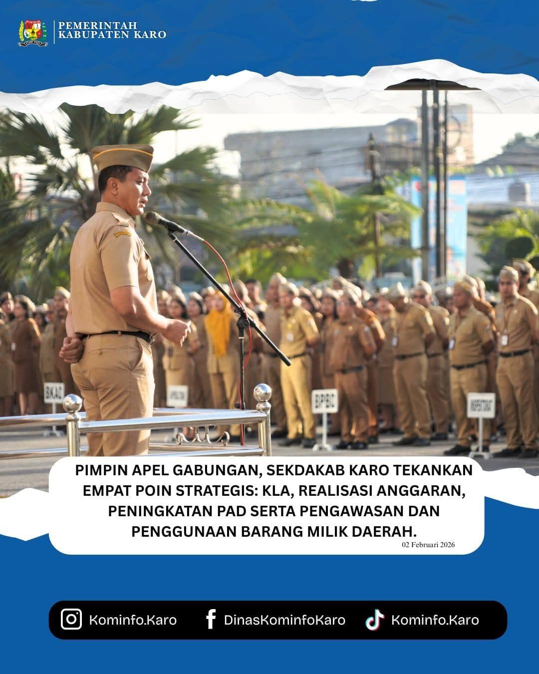 Bupati Karo Brigjen Pol (Purn) Dr.dr. Antonius Ginting, Sp.OG., M.Kes Melalui Sekretaris Daerah Kabupaten (Sekdakab) Karo, Gelora Kurnia Putra Ginting, S.STP, MM, memimpin Apel Gabungan jajaran Aparatur Sipil Negara (ASN) di lingkungan Pemerintah Kabupaten Karo, Senin (02/02/2026).