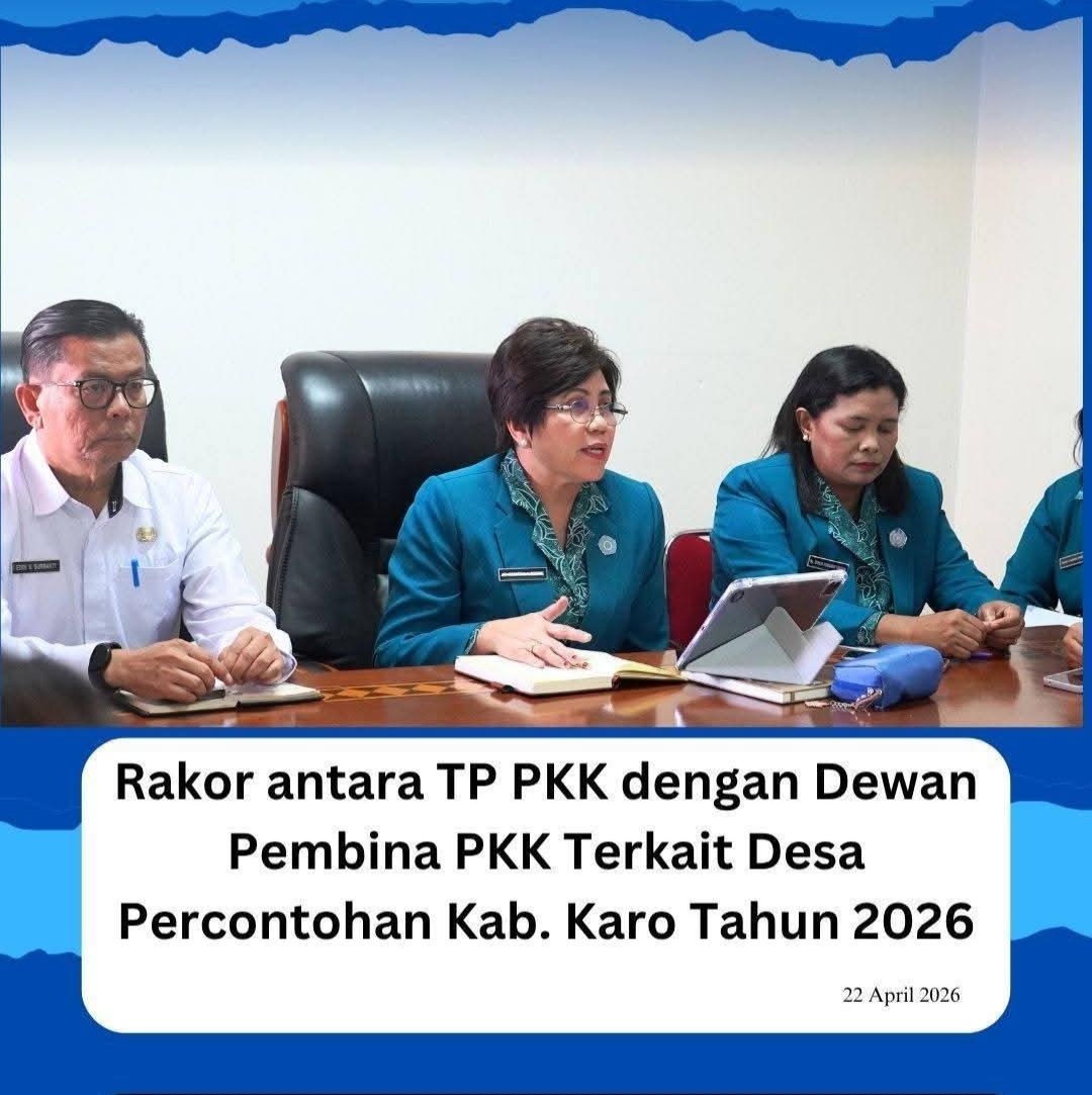 Tim Penggerak PKK Kabupaten Karo bersama Dewan Pembina PKK Kabupaten Karo menggelar Rapat Koordinasi tentang Desa Percontohan Kabupaten Karo Tahun 2026 bertempat di Ruang Rapat Rukun Sembiring, Kantor Bupati Karo,Rabu (22/4/2026)