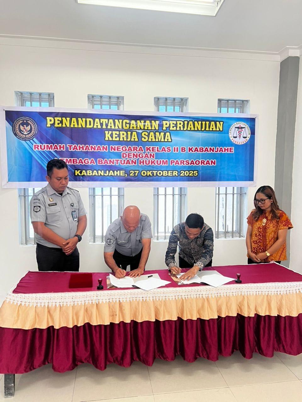 Rumah Tahanan Negara (Rutan) Kelas IIB Kabanjahe kembali menunjukkan komitmennya dalam meningkatkan pelayanan hukum bagi Warga Binaan Pemasyarakatan (WBP). Hal ini ditandai dengan penandatanganan kesepakatan kerja sama antara Rutan Kabanjahe dan Lembaga Bantuan Hukum (LBH) Parsaoran, yang dilaksanakan di Aula Rutan Kabanjahe, Senin (27/10/2025) sekira pukul 13.30 WIB.