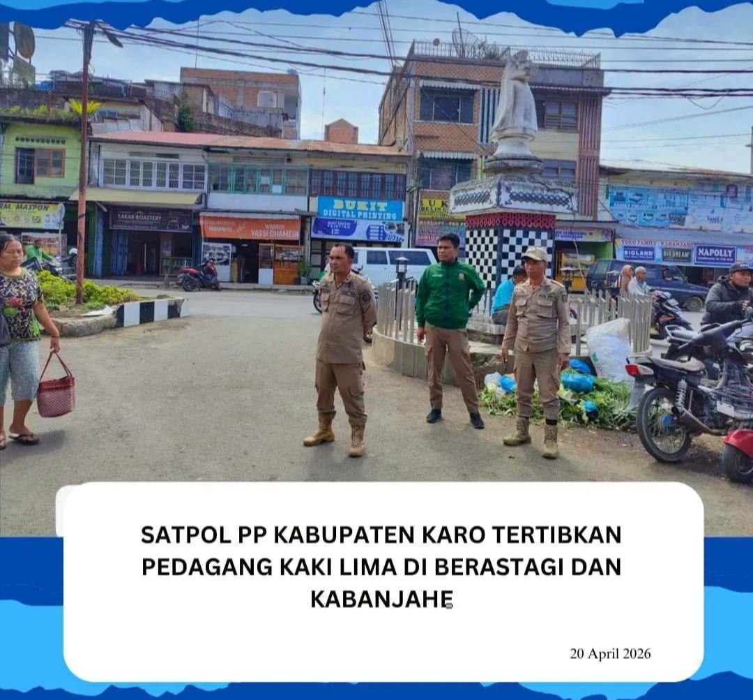 Bupati Karo, Brigjen Pol (Purn) Dr. dr. Antonius Ginting, Sp.OG, M.Kes, melalui Satuan Polisi Pamong Praja (Satpol PP) melaksanakan kegiatan penertiban pedagang kaki lima (PKL) di wilayah Kecamatan Berastagi dan Kecamatan Kabanjahe, Senin (20/04/2026).