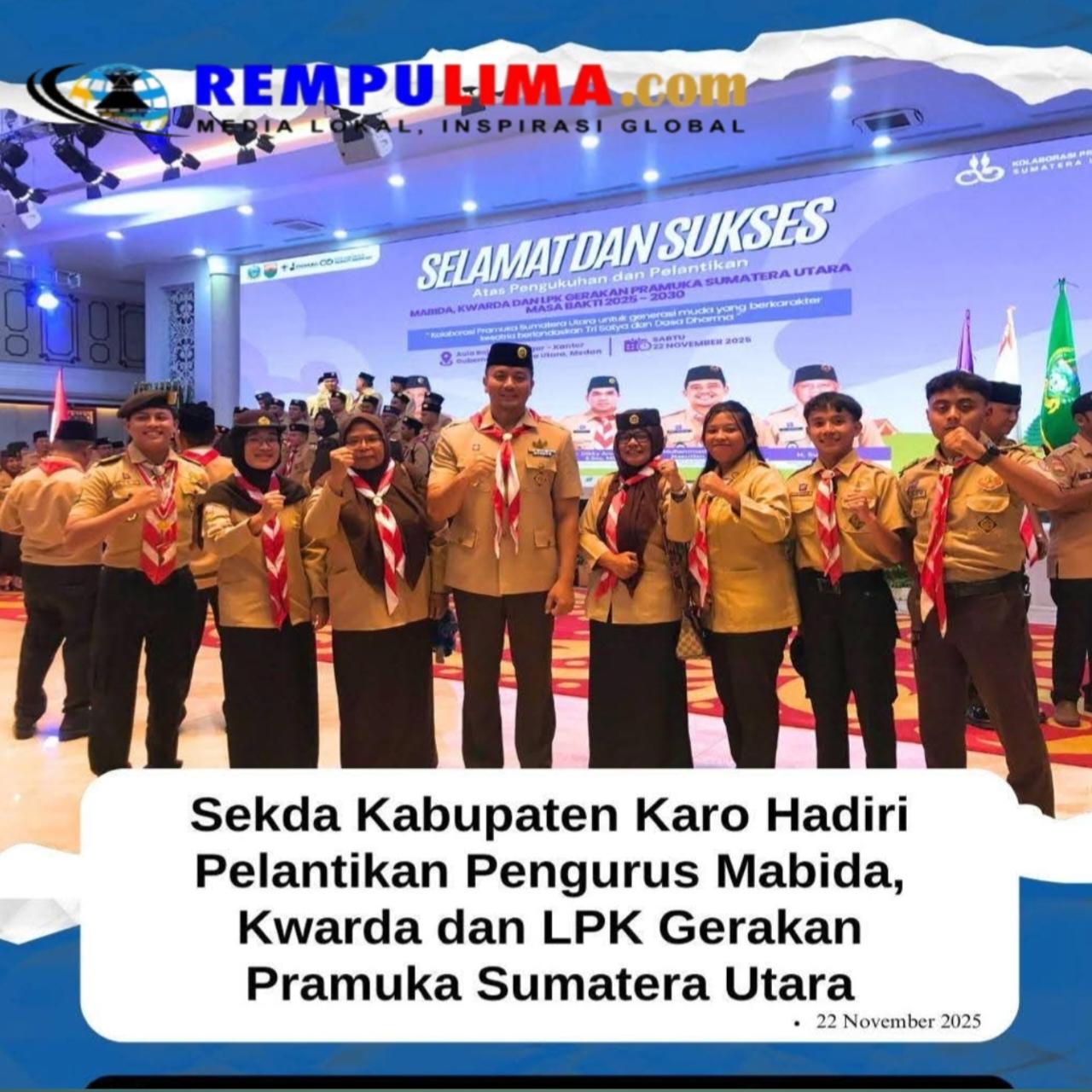Bupati Karo Antonius Ginting, selaku Ketua Majelis Pembimbing Cabang (Mabicab) Kabupaten Karo, yang diwakili Sekretaris Daerah Kabupaten Karo, Gelora Kurnia Putra Ginting, S.STP., MM., menghadiri Pelantikan Pengurus Majelis Pembimbing Daerah (Mabida), Kwartir Daerah (Kwarda), dan Lembaga Pemeriksa Keuangan (LPK) Gerakan Pramuka Sumatera Utara di Aula Raja Inal Siregar, Kantor Gubernur Sumut, Sabtu (22/11/2025).