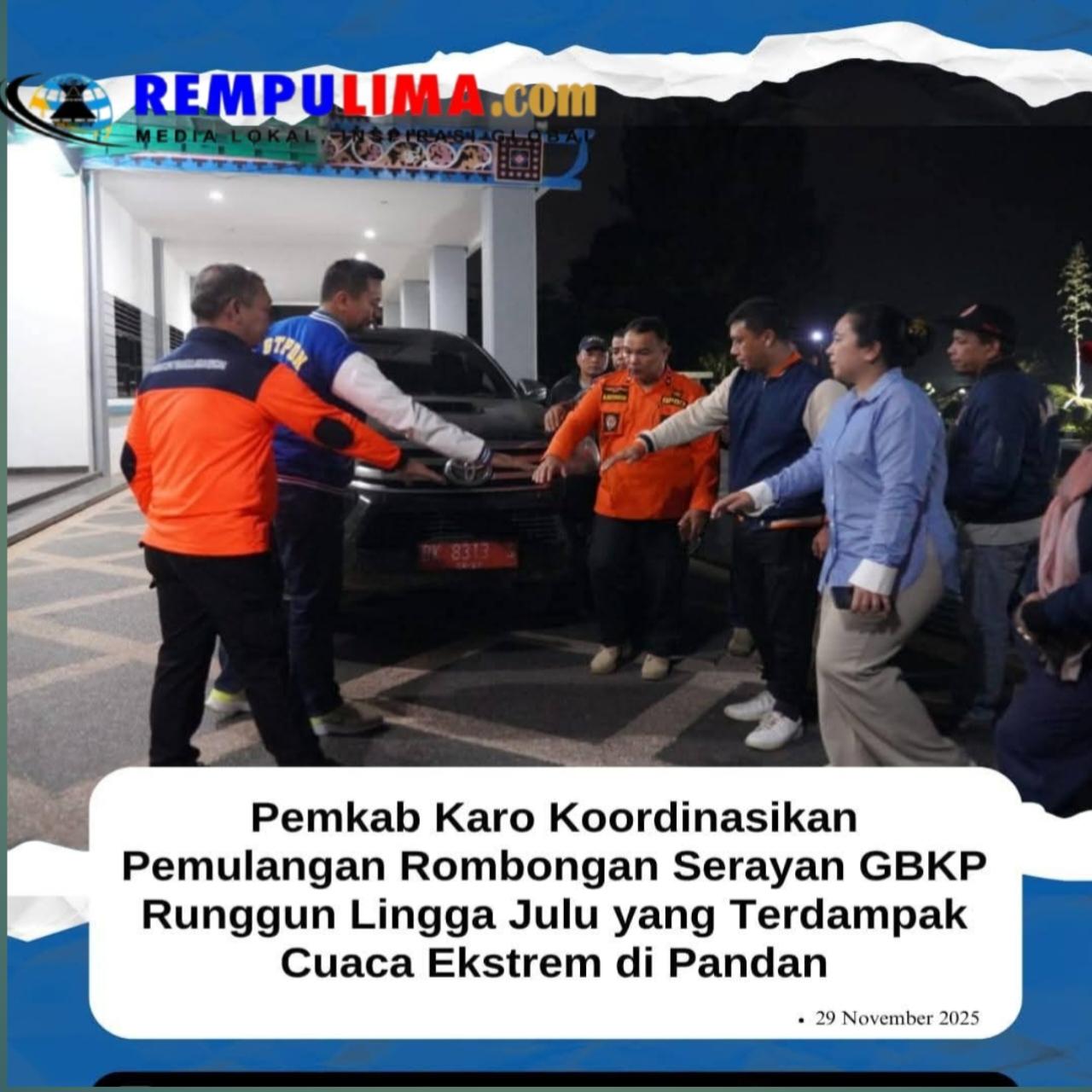 Bupati Karo, Brigjen Pol (Purn) Dr. dr. Antonius Ginting, Sp.OG., M.kes, yang diwakili oleh Sekretaris Daerah Kabupaten Karo, Gelora Kurnia Putra Ginting, S.STP. M.M lepas keberangkatan Tim Penjemputan Rombongan Serayan GBKP Runggun Lingga Julu yang terdampak cuaca ekstrem di Pandan Kabupaten Tapanuli Tengah Sumatera Utara, di Kantor Bupati Karo Jl. Letjen Jamin Ginting No. 17 Kabanjahe. Sabtu (29/11/25).