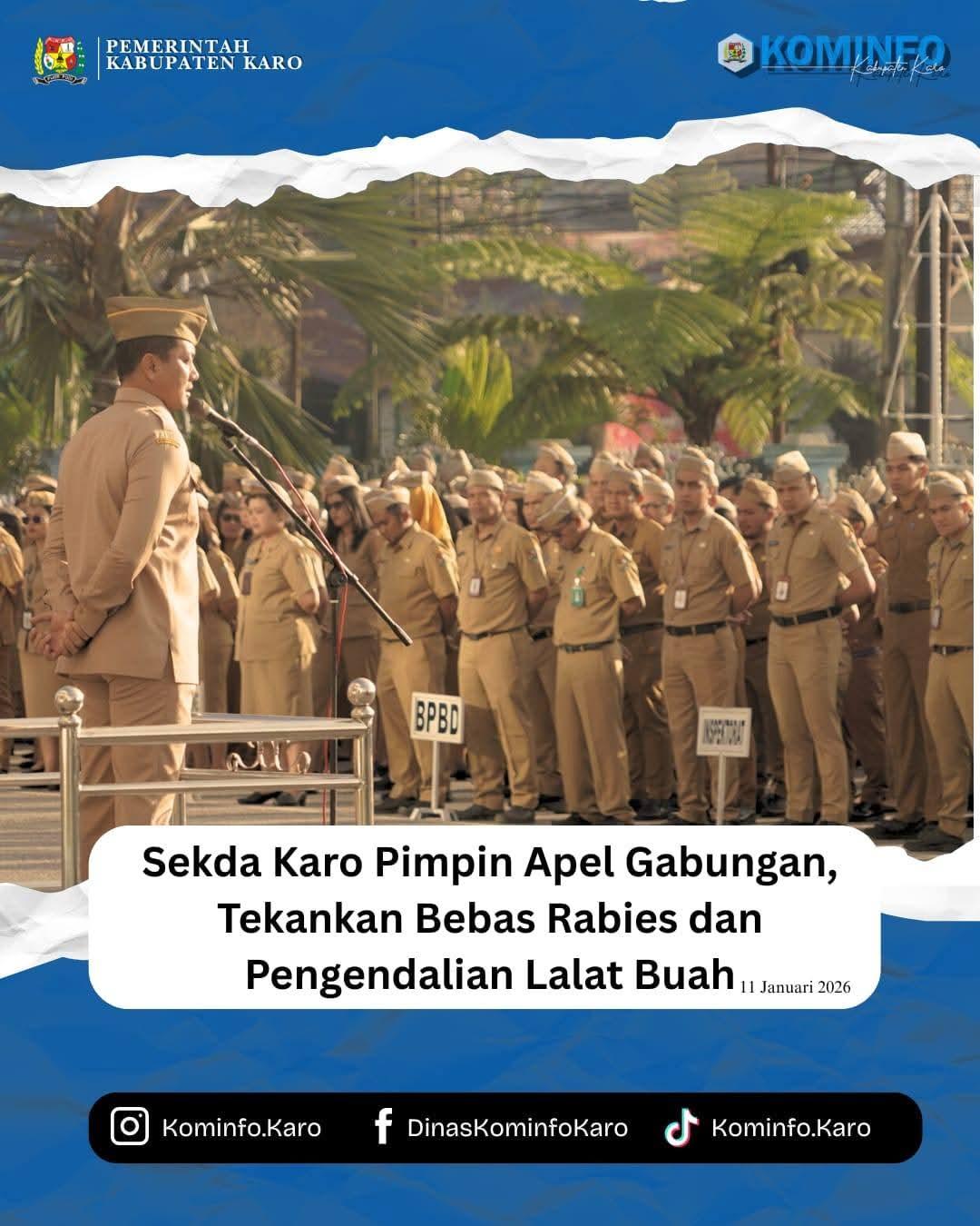 Bupati Karo, Brigjen Pol (Purn) Dr. dr. Antonius Ginting, Sp.OG., M.Kes., yang diwakilkan oleh Sekretaris Daerah Kab. Karo, Gelora Kurnia Putra Ginting, S.STP., MM., bertindak sebagai pembina apel gabungan di lingkungan Pemerintah Kabupaten Karo. Dalam kesempatan tersebut, Sekda Kab. Karo menekankan sejumlah hal strategis terkait sektor pertanian, serta peningkatan kinerja pemerintahan tahun 2026. Dilaksanakan di Halaman Kantor Bupati Karo, pada senin (12/1/2025)