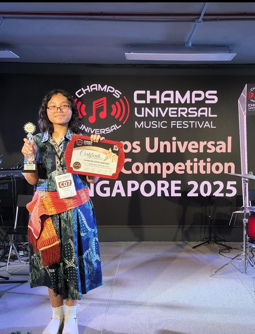 Sharon Ciota Ginting (14), berhasil meraih SILVER AWARD di Kompetisi Champs Universal Music Festival (CUMF) International Singapore 2025. Acara  Grand Final kompetisi musik internasional level junior tersebut diselenggarakan di Singapore Chang Clan Association Building di Lor 29 Geylang Singapore ,Sabtu,( 20/12/ 2025)