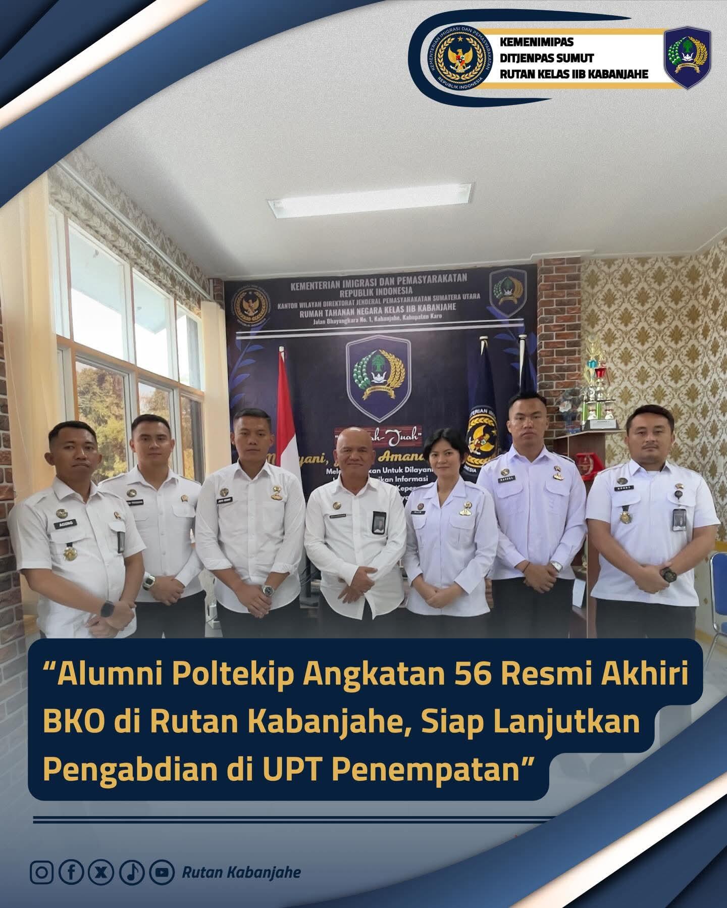 Rutan Kelas IIB Kabanjahe telah melaksanakan penutupan masa Bantuan Kendali Operasi (BKO) bagi empat orang Taruna Politeknik Ilmu Pemasyarakatan (Poltekip) Angkatan 56. Kegiatan yang merupakan tahap akhir dari proses pembentukan kader Pemasyarakatan tersebut menandai kesiapan mereka untuk ditempatkan di Unit Pelaksana Teknis (UPT) secara penuh, Rabu (11/02/2026)