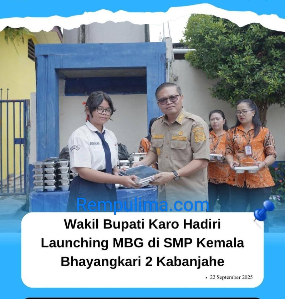 Wakil Bupati Karo Komando Tarigan,SP, hadiri launching program Makan Bergizi Gratis (MBG) di SMP Kemala Bhayangkari 2 Kabanjahe, Senin (22/09/2025). Bersama Kapolres Tanah Karo AKBP Eko Yulianto, perwakilan Kejari, perwakilan Kodim 0205 dan Badan Gizi Nasional , Wakil Bupati Karo berkesempatan memberikan secara simbolis paket perdana makan bergizi kepada para siswa.